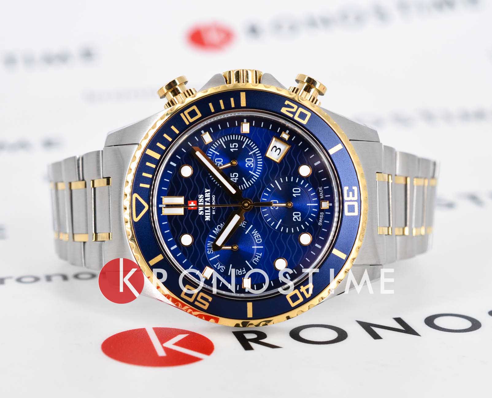 Часы Swiss Military SM34101.04 — это элегантный мужской хронограф, объединяющий швейцарское качество и современный стиль. Корпус диаметром 46 мм выполнен из нержавеющей стали, что обеспечивает долговечность и надёжность. Синий вращающийся безельБезельВнешний ободок, закрепляющий стекло. В спортивных часах так называется поворотное кольцо с делениями на циферблате, выполняет роль таймера – замеряет отрезки времени на шкале. Неподвижный безель – элемент декора. Однонаправленно вращающийся безель на дайверских часах позволяет фиксировать моменты погружения и выныривания на поверхность. с золотистыми минутными метками и синий циферблат с крупными золотистыми стрелками создают стильный и запоминающийся облик.