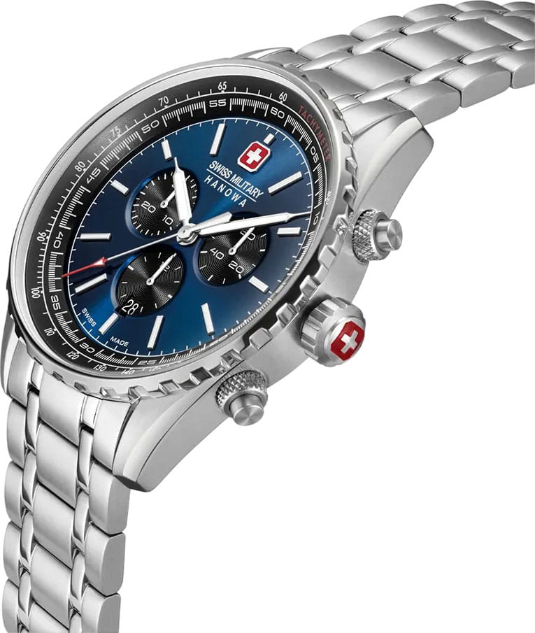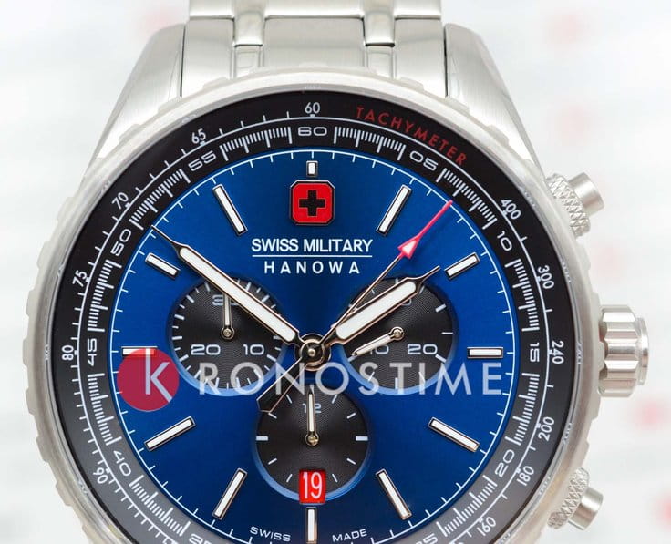 Мужские швейцарские часы Swiss Military Hanowa Afterburn Chrono SMWGI0000308 с хронографомХронографФункция позволяет измерять отрезки времени с особой точностью: часы, минуты, секунды. Верным признаком хронографа является наличие на циферблате 3 дополнительных окошек-счётчиков. и секундомеромСекундомерСекундоме́р — прибор, способный измерять интервалы времени с точностью до долей секунды.. Сапфировое стеклоСапфировое стеклоПрочный и надёжный материал из кристалла сапфира синтетического происхождения, характеризующийся особой твёрдостью и устойчивостью к царапинам и повреждениям. с антибликовым покрытием защищает циферблат от царапин и обеспечивает отличную читаемость при любом освещении. Корпус из нержавеющей стали диаметром 44 мм сбалансирован и элегантен. Браслет с раскладной застёжкойРаскладная застёжкаТакой тип застёжки используется только на браслетах из металла. Она никогда не раскрывается полностью, происходит разделение на 2 и более частей. Раскладывающая застёжка снизит вероятность потери часов к минимуму. идеально дополняют дизайн часов, обеспечивая комфортное ношение. Люминесцентное покрытиеЛюминесцентное покрытиеПозволяет считывать показания времени в темноте. Производители наносят на стрелки, часовые индексы, безель или поверхность циферблата светонакопительный состав, дающий холодное свечение. стрелок и меток позволит вам следить за временем даже в полной темноте. Стальной безельБезельВнешний ободок, закрепляющий стекло. В спортивных часах так называется поворотное кольцо с делениями на циферблате, выполняет роль таймера – замеряет отрезки времени на шкале. Неподвижный безель – элемент декора. Однонаправленно вращающийся безель на дайверских часах позволяет фиксировать моменты погружения и выныривания на поверхность. с PVD-покрытиемPVDУльтратонкое покрытие наносится в технике вакуумного напыления, сочетает в себе нитрид титана особой прочности со слоем золота или оксида хрома. Несёт в себе декоративную или защитную функцию.. Часы оснащены центральной секундной стрелкой и окошком даты в положении «6 часов», что делает их функциональными для повседневного использования. ТахиметрТахиметрРазмеченная шкала, располагается на ободке или безеле часов. Тахиметр позволяет рассчитать скорость на определённом участке пути, расстояние измеряется в километрах или милях. по внешнему краю. Водонепроницаемость до 100 метров. Идеальный выбор для тех, кто ценит качество и долговечность.