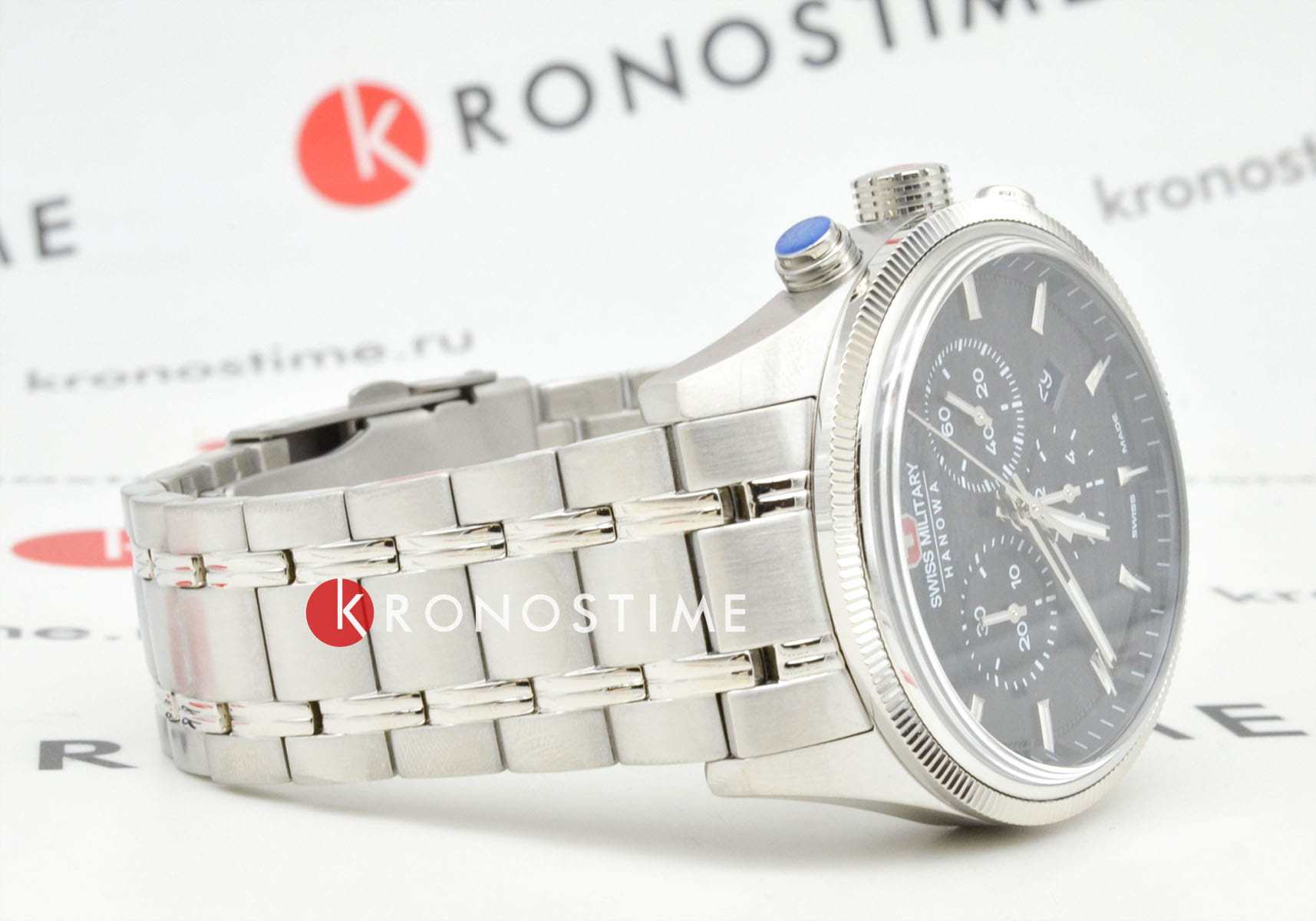 Мужские швейцарские часы-хронографХронографФункция позволяет измерять отрезки времени с особой точностью: часы, минуты, секунды. Верным признаком хронографа является наличие на циферблате 3 дополнительных окошек-счётчиков. Swiss Military Hanowa SMWGI0003102, кварцевый механизм с высокой точностью. Сапфировое стеклоСапфировое стеклоПрочный и надёжный материал из кристалла сапфира синтетического происхождения, характеризующийся особой твёрдостью и устойчивостью к царапинам и повреждениям. устойчивое к появлению царапин, обладающее высокой прозрачностью. Окошко даты находится в положении между 4 и 5 часами. Класс водозащиты: 100 метров, позволит плавать, нырять и заниматься другими водными видами спорта. Корпус часов изготовлен из стали. Стальной браслет на раскладной застёжкеРаскладная застёжкаТакой тип застёжки используется только на браслетах из металла. Она никогда не раскрывается полностью, происходит разделение на 2 и более частей. Раскладывающая застёжка снизит вероятность потери часов к минимуму.. Стрелки и метки с люминесцентным покрытиемЛюминесцентное покрытиеПозволяет считывать показания времени в темноте. Производители наносят на стрелки, часовые индексы, безель или поверхность циферблата светонакопительный состав, дающий холодное свечение..