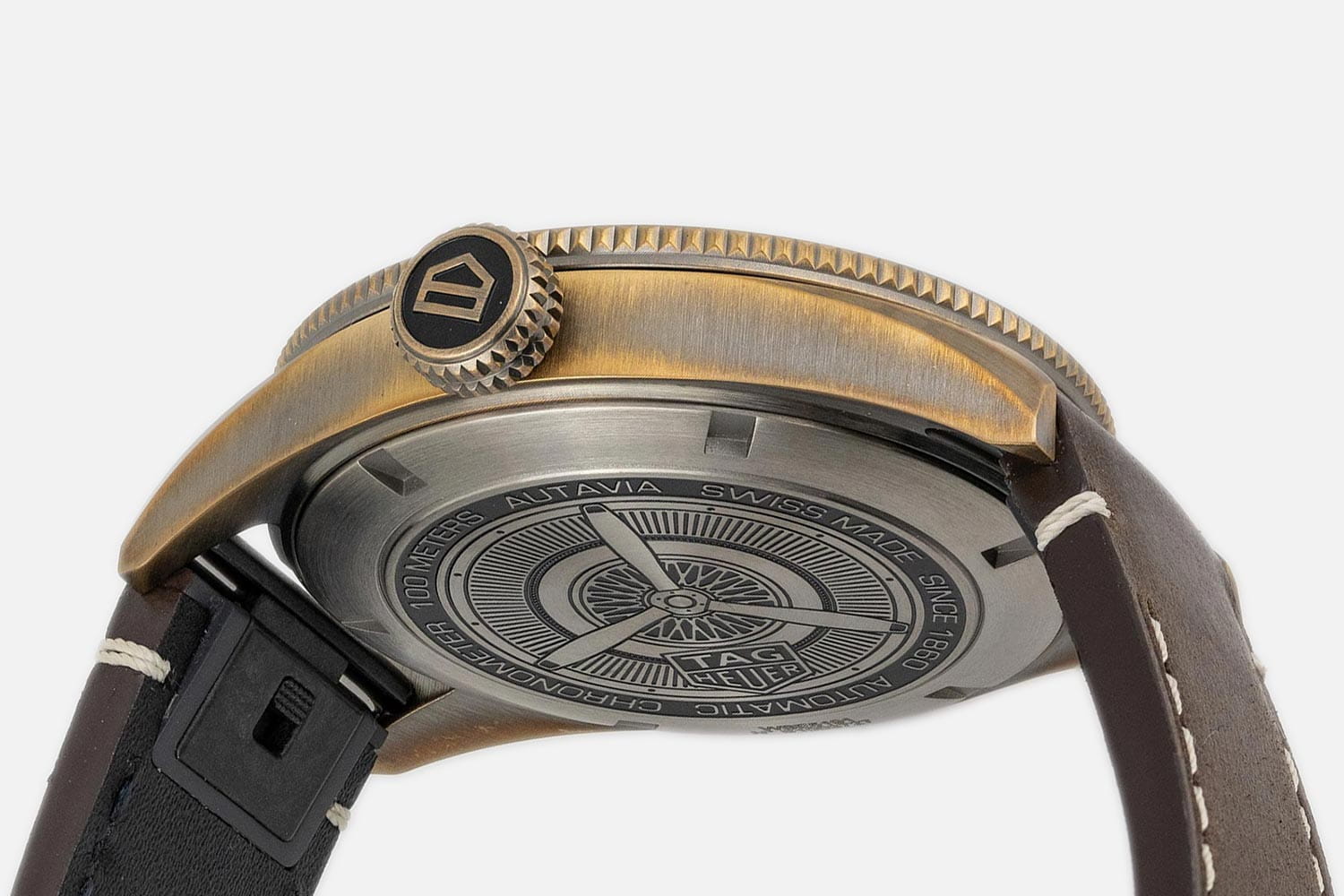 Мужские винтажные швейцарский часы пилоты TAG Heuer Autavia WBE5191.FC8276, механический механизм (автоматический калибр) с высокой точностью. Сапфировое стекло устойчивое к появлению царапин, обладающее высокой прозрачностью. Класс водозащиты: 100 метров, позволит плавать, нырять и заниматься другими водными видами спорта. Корпус часов изготовлен из бронзы, цвета.