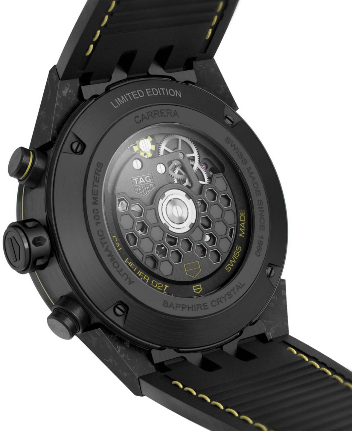 Оригинальные и бескомпромиссные часы швейцарского качества, подчеркнут вашу индивидуальность и изысканный вкус. Carrera Calibre Heuer 02T. Лимитированная серия. Скелетонизированные часы-хронографХронографФункция позволяет измерять отрезки времени с особой точностью: часы, минуты, секунды. Верным признаком хронографа является наличие на циферблате 3 дополнительных окошек-счётчиков. с секундомеромСекундомерСекундоме́р — прибор, способный измерять интервалы времени с точностью до долей секунды. и тахиметром. Турбийон. В механизме 33 камня, частота 28800 полуколебаний в час. Запас хода 65 часов. Рифленая стальная с PVDPVDУльтратонкое покрытие наносится в технике вакуумного напыления, сочетает в себе нитрид титана особой прочности со слоем золота или оксида хрома. Несёт в себе декоративную или защитную функцию. покрытием заводная головка с каучуковой накладкой. Циферблат с люминесцентным покрытиемЛюминесцентное покрытиеПозволяет считывать показания времени в темноте. Производители наносят на стрелки, часовые индексы, безель или поверхность циферблата светонакопительный состав, дающий холодное свечение. стрелок и меток, дополнен сапфировым стекломСапфировое стеклоПрочный и надёжный материал из кристалла сапфира синтетического происхождения, характеризующийся особой твёрдостью и устойчивостью к царапинам и повреждениям., устойчивым к появлению царапин и обладающее высокой прозрачностью. Стальная завинчивающаяся задняя крышка с сапфировым стеклом позволит наблюдать вам за работой точнейшего механизма. Накладные полированные и матовые индексы. Накладная эмблема TAG Heuer. Браслет с с раскладной застёжкойРаскладная застёжкаТакой тип застёжки используется только на браслетах из металла. Она никогда не раскрывается полностью, происходит разделение на 2 и более частей. Раскладывающая застёжка снизит вероятность потери часов к минимуму.. Застежка с системой блокировки. Дизайн этих роскошных часов вдохновлен автомобильными гонками, которые так любят настоящие мужчины.