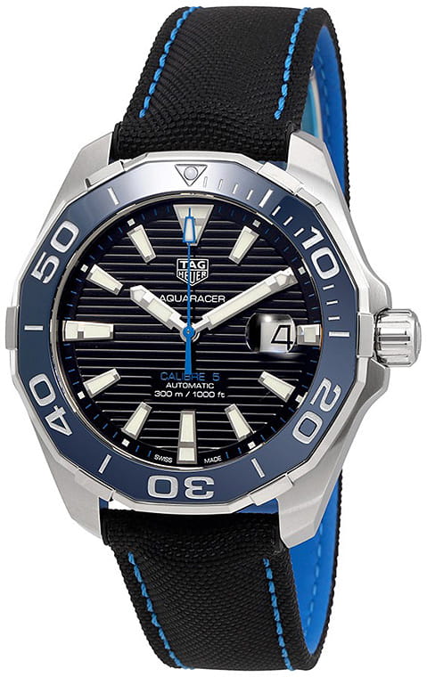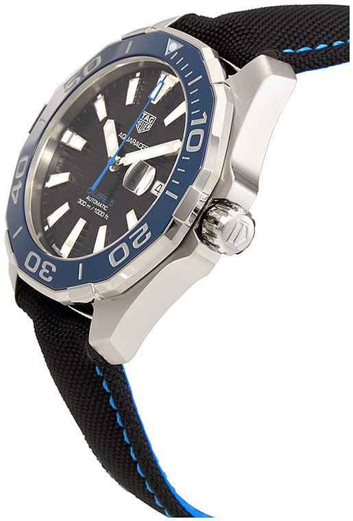 TAG Heuer Aquaracer WAY201C.FC6395 — стильные и надёжные часы, созданные для активного образа жизни и водных приключений. Корпус диаметром 43 мм выполнен из нержавеющей стали с чередующейся полированной и матовой отделкой, что придаёт модели современный и динамичный вид. Однонаправленный вращающийся безельБезельВнешний ободок, закрепляющий стекло. В спортивных часах так называется поворотное кольцо с делениями на циферблате, выполняет роль таймера – замеряет отрезки времени на шкале. Неподвижный безель – элемент декора. Однонаправленно вращающийся безель на дайверских часах позволяет фиксировать моменты погружения и выныривания на поверхность. с синей керамической вставкой оснащён минутной разметкой и светящимся маркером на позиции «12 часов», обеспечивая удобство при отсчёте времени погружения. Чёрный циферблат с вертикальным гильоше дополнен накладными часовыми индексами и стрелками с люминесцентным покрытиемЛюминесцентное покрытиеПозволяет считывать показания времени в темноте. Производители наносят на стрелки, часовые индексы, безель или поверхность циферблата светонакопительный состав, дающий холодное свечение., что гарантирует отличную читаемость в любых условиях освещения. Окошко даты с увеличительным стеклом расположено на отметке «3 часа» для удобства. Защиту циферблата обеспечивает сапфировое стеклоСапфировое стеклоПрочный и надёжный материал из кристалла сапфира синтетического происхождения, характеризующийся особой твёрдостью и устойчивостью к царапинам и повреждениям. с антибликовым покрытиемАнтибликовое покрытиеСлой оксида металла в 0,13-0,3 микрон, благодаря которому стекло часов не бликует и не отражает свет. Антибликовое покрытие уменьшает отражение света в 10 раз, обеспечивая отличную читаемость показателей циферблата.. Внутри установлен швейцарский автоматический механизм Calibre 5, обеспечивающий точность хода и запас энергии до 38 часов. Часы укомплектованы чёрным нейлоновым ремешком с кожаной подкладкой, а раскладная застёжкаРаскладная застёжкаТакой тип застёжки используется только на браслетах из металла. Она никогда не раскрывается полностью, происходит разделение на 2 и более частей. Раскладывающая застёжка снизит вероятность потери часов к минимуму. с двойной блокировкой гарантирует надёжную фиксацию на запястье. Водонепроницаемость 300 метров делает модель идеальным выбором для занятий водными видами спорта, включая дайвинг.