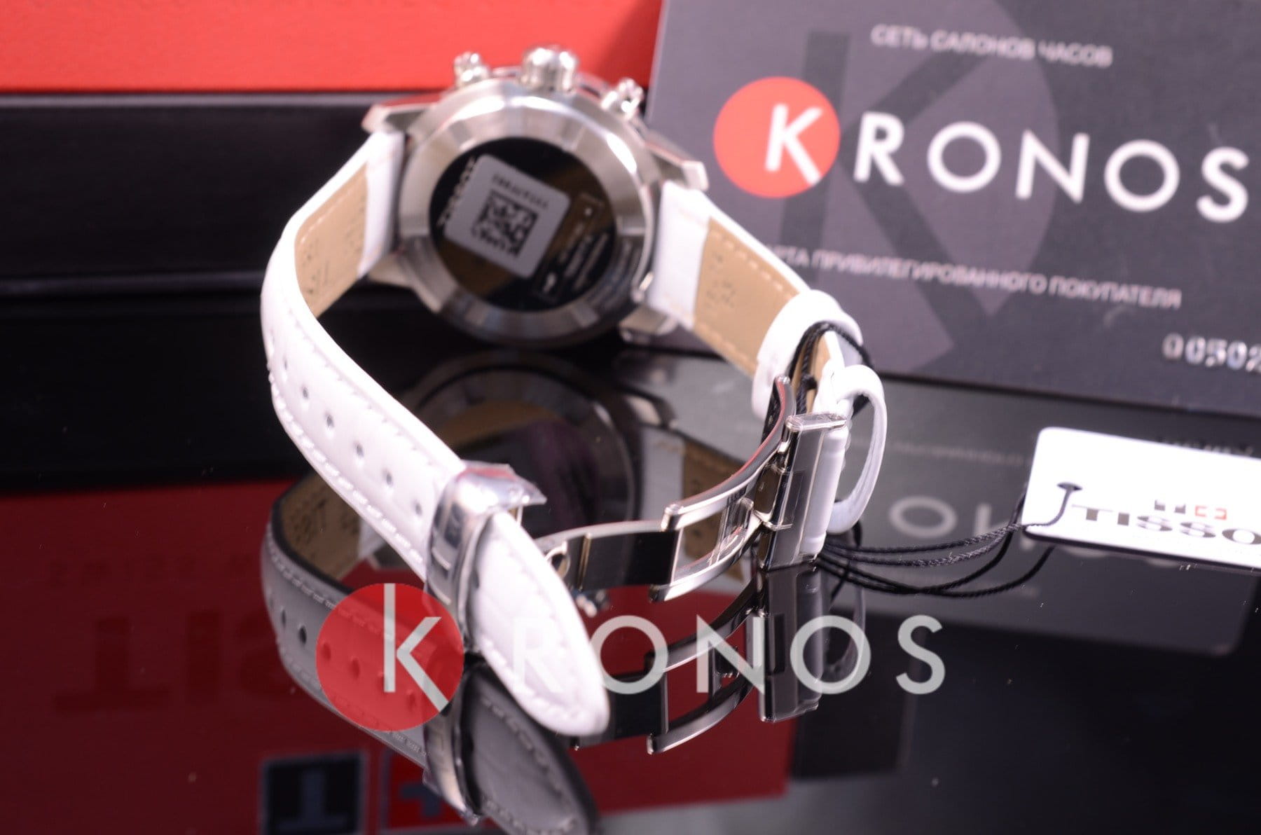 TISSOT T-Sport PRC 200 Quartz Chronograph - женские кварцевые наручные часы. Корпус этих часов среднего размера (35 мм) и выполнен из нержавеющей стали L316 металлического цвета. Модель имеет устойчивое к царапинам сапфировое стекло, ремешок из натуральной кожи белого цвета, белый циферблат. Калибр механизма: ETA G15.211. Класс водозащиты: 200 м / 20 АТМ (разрешается нырять с аквалангом на глубину). Дополнительные функции и особенности: отображение числа, хронограф (секундомер), тахиметр