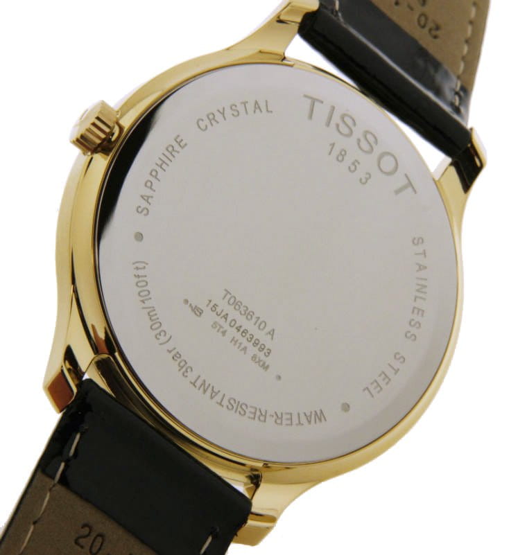 TISSOT T063.610.36.057.00 T-Classic Tradition - женские кварцевые наручные часы. Корпус этих часов среднего размера (42 мм) и выполнен из нержавеющей стали L316 с PVD-покрытием цвета желтого золота. Модель TISSOT T063.610.36.057.00 T-Classic Tradition имеет устойчивое к царапинам сапфировое стекло, ремешок из натуральной кожи черного цвета, черный циферблат. Калибр механизма: ETA F06.111. Класс водозащиты: 30 м / 3 АТМ (защита от брызг и случайных капель).