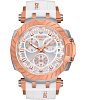 Бело-золотистый аксессуар выполнен в спортивном стиле, отдельные детали напоминают о гоночных мотоциклах: фигурный безельБезельВнешний ободок, закрепляющий стекло. В спортивных часах так называется поворотное кольцо с делениями на циферблате, выполняет роль таймера – замеряет отрезки времени на шкале. Неподвижный безель – элемент декора. Однонаправленно вращающийся безель на дайверских часах позволяет фиксировать моменты погружения и выныривания на поверхность. напоминает о тормозных дисках, необычная задняя крышка, крупные элементы, характерная апертура даты. Силиконовый ремешок доставляет комфорт при ношении и устойчив к износу. Кварцевый механизм ETA G10.212. Стекло из сапфира. PVD-покрытиеPVDУльтратонкое покрытие наносится в технике вакуумного напыления, сочетает в себе нитрид титана особой прочности со слоем золота или оксида хрома. Несёт в себе декоративную или защитную функцию. цвета розового золота. Люминесцентная подсветкаЛюминесцентное покрытиеПозволяет считывать показания времени в темноте. Производители наносят на стрелки, часовые индексы, безель или поверхность циферблата светонакопительный состав, дающий холодное свечение.. Водостойкость 100 метров. ХронографХронографФункция позволяет измерять отрезки времени с особой точностью: часы, минуты, секунды. Верным признаком хронографа является наличие на циферблате 3 дополнительных окошек-счётчиков., секундомер, тахиметрТахиметрРазмеченная шкала, располагается на ободке или безеле часов. Тахиметр позволяет рассчитать скорость на определённом участке пути, расстояние измеряется в километрах или милях.. Габариты: 47,6 x 43 x 12,3 мм.