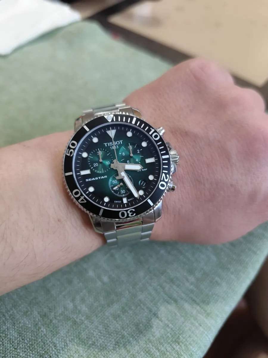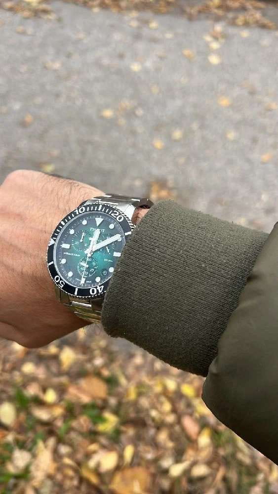 На фоне серебристого браслета и темного безеляБезельВнешний ободок, закрепляющий стекло. В спортивных часах так называется поворотное кольцо с делениями на циферблате, выполняет роль таймера – замеряет отрезки времени на шкале. Неподвижный безель – элемент декора. Однонаправленно вращающийся безель на дайверских часах позволяет фиксировать моменты погружения и выныривания на поверхность. ярко выделяется зеленый циферблат, отлично видны серебристые стрелки и часовые метки с люминесцентным покрытиемЛюминесцентное покрытиеПозволяет считывать показания времени в темноте. Производители наносят на стрелки, часовые индексы, безель или поверхность циферблата светонакопительный состав, дающий холодное свечение.. Кварцевые часы оснащены батареей Renata 394. Завинчивающиеся кнопки, головка, прозрачная задняя крышка. Сапфировое стекло. Апертура даты. Габариты: 43 x 43 x 12,7 мм.