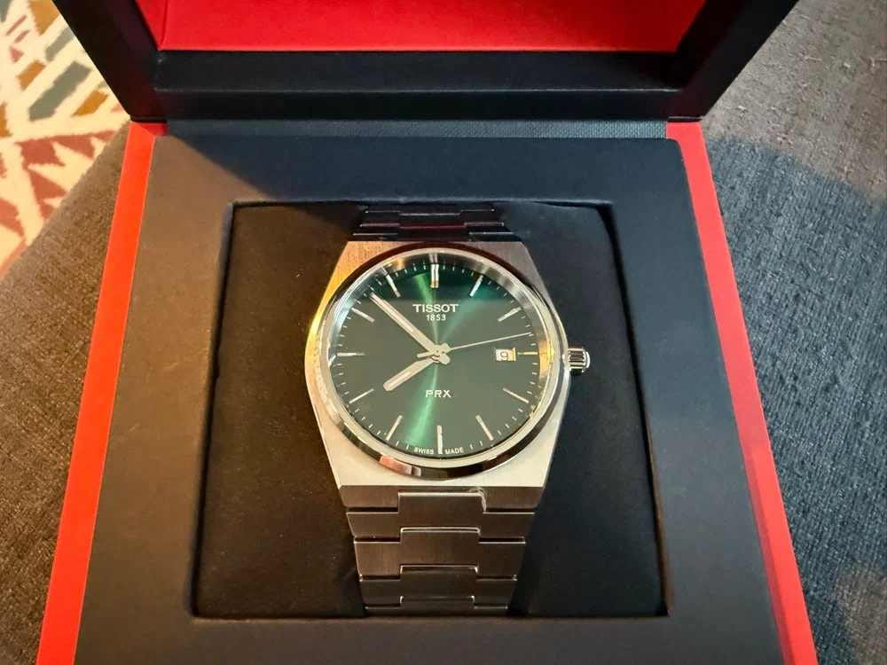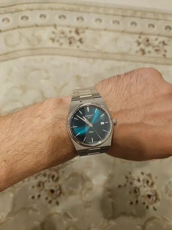 Tissot PRX 40mm (модель T137.410.11.091.00) – элегантные мужские часы, сочетающие современный стиль с передовыми технологиями. Корпус диаметром 40 мм выполнен из нержавеющей стали 316L, что обеспечивает надёжность и долговечность. Зелёный циферблат с эффектом солнечных лучей защищён сапфировым стекломСапфировое стеклоПрочный и надёжный материал из кристалла сапфира синтетического происхождения, характеризующийся особой твёрдостью и устойчивостью к царапинам и повреждениям., устойчивым к царапинам.