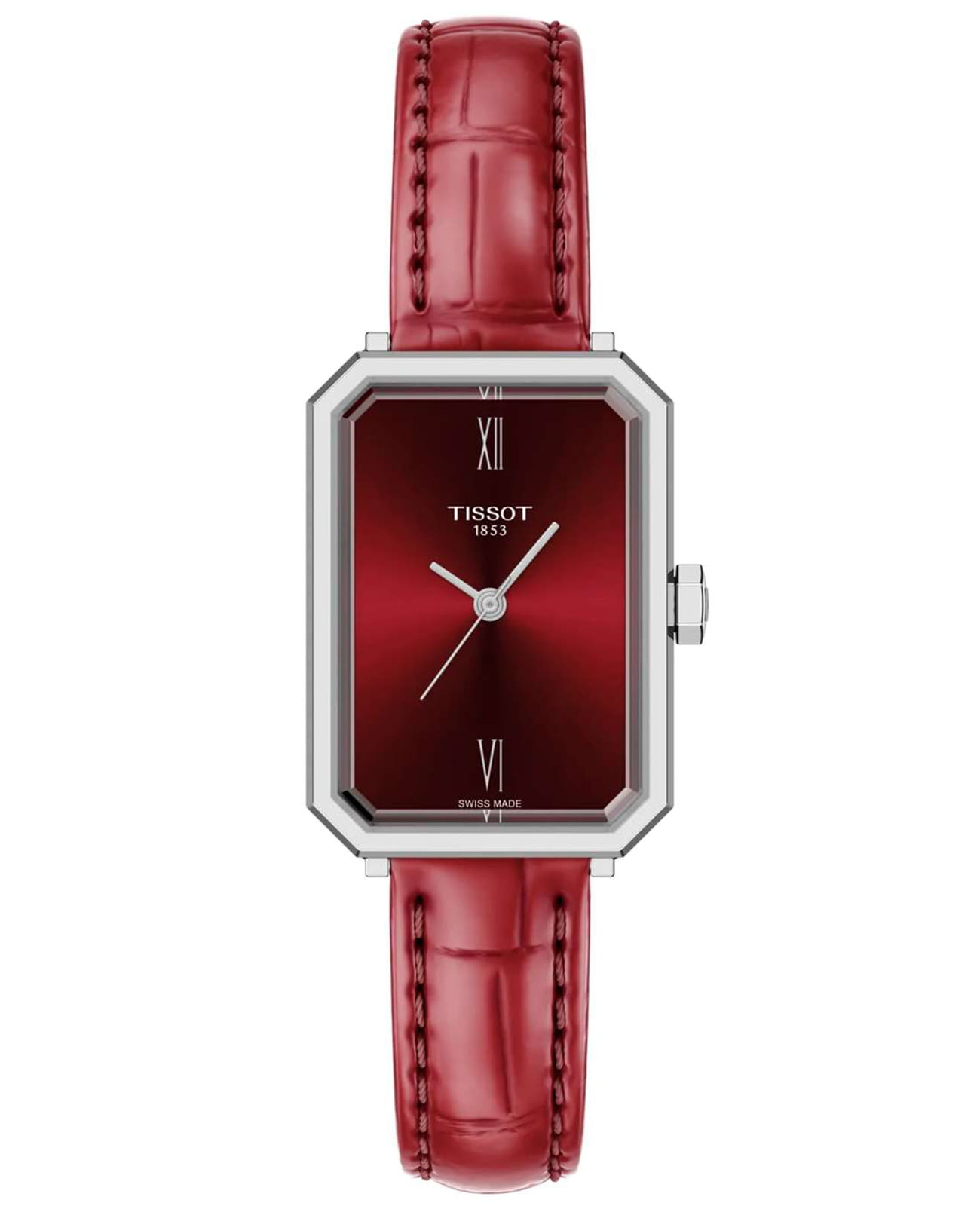 Женские кварцевые часы Tissot — это элегантный аксессуар, вдохновлённый стилем ар-деко 1920-х годов. Модель SRV сочетает геометрические формы и ретро-эстетику с современной технологией. Корпус прямоугольной формы размером 30×21,8 мм выполнен из нержавеющей стали 316L. Циферблат тёмно-красного цвета оформлен римскими цифрами на позициях 12 и 6 часов. Циферблат защищён сапфировым стекломСапфировое стеклоПрочный и надёжный материал из кристалла сапфира синтетического происхождения, характеризующийся особой твёрдостью и устойчивостью к царапинам и повреждениям. с фасетированной огранкой, повторяющей форму корпуса. Часы оснащены красным кожаным ремешком из глянцевой кожи с эффектом лака и классической пряжкой. Благодаря системе быстрой замены ремешок можно легко поменять без использования инструментов. Водонепроницаемость 50 м позволяет использовать часы в повседневных условиях. Идеальный выбор для тех, кто ценит стиль, наследие и швейцарское качество.