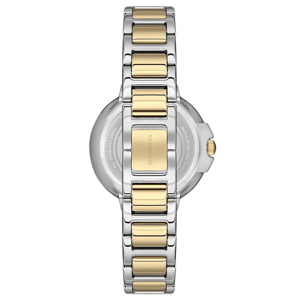 Женские элегантные часы U.S. Polo Assn. Stile USPA2012-06 кварцевый механизм с высокой точностью. Минеральное стеклоМинеральное стеклоМинеральное стекло представляет собой искусственно выращенный минерал кварца. Такое стекло отличается особой устойчивостью к повреждениям и царапинам. Уступает по некоторым качествам сапфировому стеклу. устойчивое к появлению царапин, обладающее высокой прозрачностью. Изысканный корпус изготовлен из нержавеющей стали с неподвижным безелемБезельВнешний ободок, закрепляющий стекло. В спортивных часах так называется поворотное кольцо с делениями на циферблате, выполняет роль таймера – замеряет отрезки времени на шкале. Неподвижный безель – элемент декора. Однонаправленно вращающийся безель на дайверских часах позволяет фиксировать моменты погружения и выныривания на поверхность. с IP-покрытиемIP-покрытиеМетод ионного напыления. Демонстрирует повышенную устойчивость к истиранию, окислению и химическим веществам. Под воздействием высокого давления и температуры около 1500°C молекулы металла надёжно соединяются с частицами корпуса часов.. Лаконичные центральные часовая, минутная и секундная стрелки. Класс водозащиты: 50 метров, позволит защитить корпус от случайных брызг или капель дождя. Стальной браслет с частичным IP-покрытиемIP-покрытиеМетод ионного напыления. Демонстрирует повышенную устойчивость к истиранию, окислению и химическим веществам. Под воздействием высокого давления и температуры около 1500°C молекулы металла надёжно соединяются с частицами корпуса часов. с ювелирной застежкой обеспечивает комфорт и удобство в использовании, добавляя завершающий штрих к этому стильному аксессуару. Окошко даты находится в положении 6 часов. Циферблат с кристаллами подчёркивает изысканный характер часов, создавая универсальный образ, подходящий как для повседневных ситуаций, так и для особых случаев.
