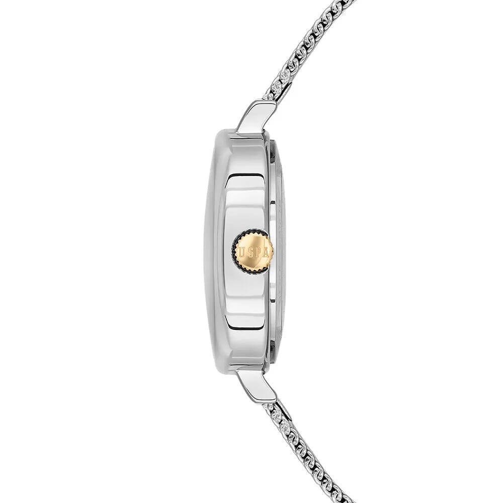 Женские часы U.S. Polo Assn. Stile USPA2087-04, кварцевый механизм с высокой точностью. Минеральное стеклоМинеральное стеклоМинеральное стекло представляет собой искусственно выращенный минерал кварца. Такое стекло отличается особой устойчивостью к повреждениям и царапинам. Уступает по некоторым качествам сапфировому стеклу. устойчивое к появлению царапин, обладающее высокой прозрачностью. Изысканный корпус изготовлен из нержавеющей стали. Лаконичные центральные часовая, минутная и секундная стрелки. Водонепроницаемость 3 АТМ позволяет использовать часы в повседневных условиях — при мытье рук или под лёгким дождём. Браслет выполнен в технике миланского плетения из стали и оснащён раскладным замкомРаскладная застёжкаТакой тип застёжки используется только на браслетах из металла. Она никогда не раскрывается полностью, происходит разделение на 2 и более частей. Раскладывающая застёжка снизит вероятность потери часов к минимуму., обеспечивающий комфорт и уверенную фиксацию на запястье, а также добавляя завершающий штрих к этому стильному аксессуару. Циферблат подчёркивает изысканный характер часов, создавая универсальный образ, подходящий как для повседневных ситуаций, так и для особых случаев.