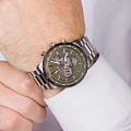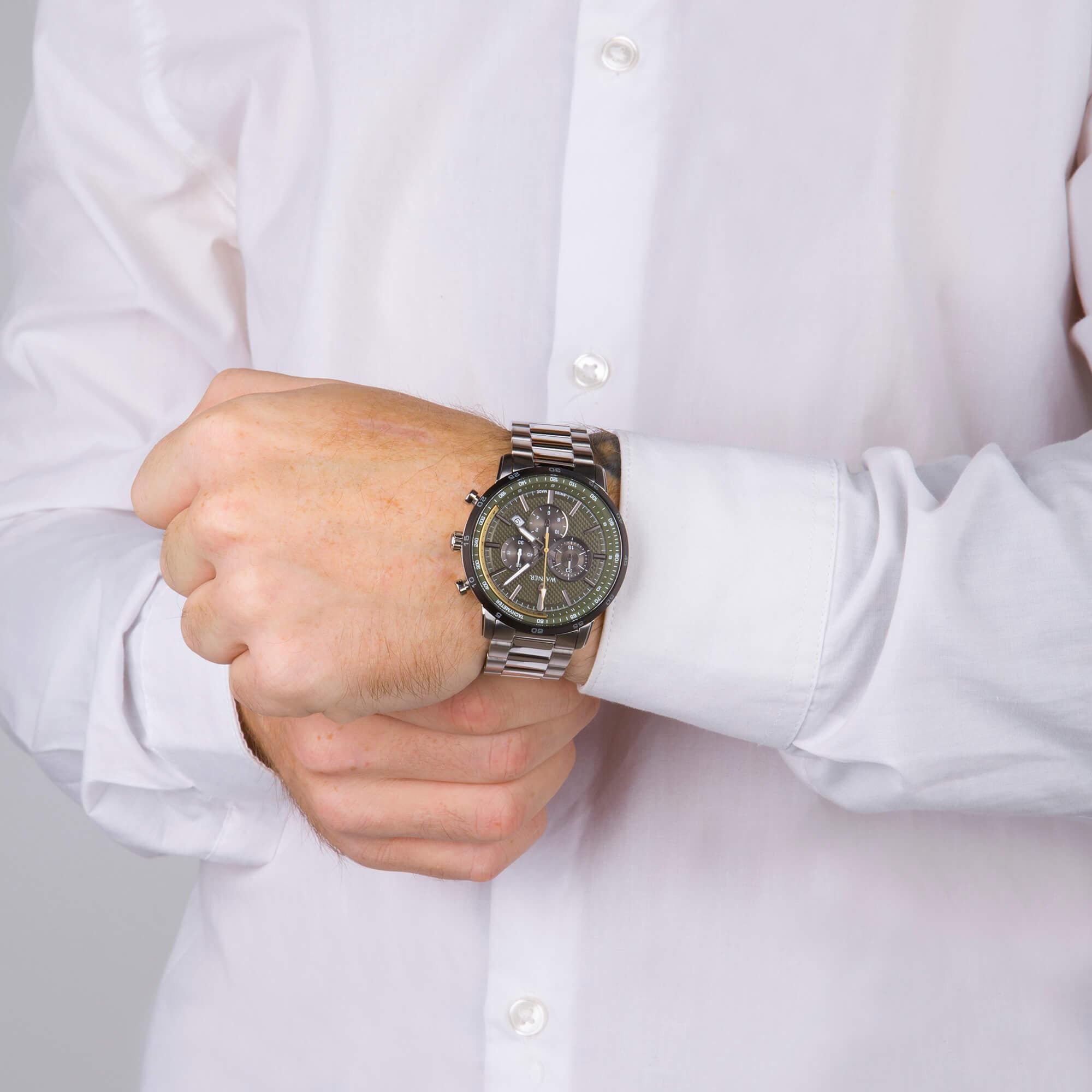 Мужские наручные часы-хронографХронографФункция позволяет измерять отрезки времени с особой точностью: часы, минуты, секунды. Верным признаком хронографа является наличие на циферблате 3 дополнительных окошек-счётчиков. WA.19032-E с надежным кварцевым механизмом. Корпус часов изготовлен из нержавеющей стали 316L. Стальной браслет на застежке "бабочке". Окошко даты находится в между 4 и 5 часами. Сапфировое стеклоСапфировое стеклоПрочный и надёжный материал из кристалла сапфира синтетического происхождения, характеризующийся особой твёрдостью и устойчивостью к царапинам и повреждениям.. Уровень водозащиты: 100 метров, позволит плавать, нырять и заниматься другими водными видами спорта. 12 и 24-часовой формат времени. БезельБезельВнешний ободок, закрепляющий стекло. В спортивных часах так называется поворотное кольцо с делениями на циферблате, выполняет роль таймера – замеряет отрезки времени на шкале. Неподвижный безель – элемент декора. Однонаправленно вращающийся безель на дайверских часах позволяет фиксировать моменты погружения и выныривания на поверхность. с PVD-покрытиемPVDУльтратонкое покрытие наносится в технике вакуумного напыления, сочетает в себе нитрид титана особой прочности со слоем золота или оксида хрома. Несёт в себе декоративную или защитную функцию.. Стрелки с люминесцентным покрытиемЛюминесцентное покрытиеПозволяет считывать показания времени в темноте. Производители наносят на стрелки, часовые индексы, безель или поверхность циферблата светонакопительный состав, дающий холодное свечение.. Встроенный Второй часовой поясВторой часовой поясФункция, позволяющая отображать время двух часовых поясов одновременно., секундомерСекундомерСекундоме́р — прибор, способный измерять интервалы времени с точностью до долей секунды. и тахиметрТахиметрРазмеченная шкала, располагается на ободке или безеле часов. Тахиметр позволяет рассчитать скорость на определённом участке пути, расстояние измеряется в километрах или милях..